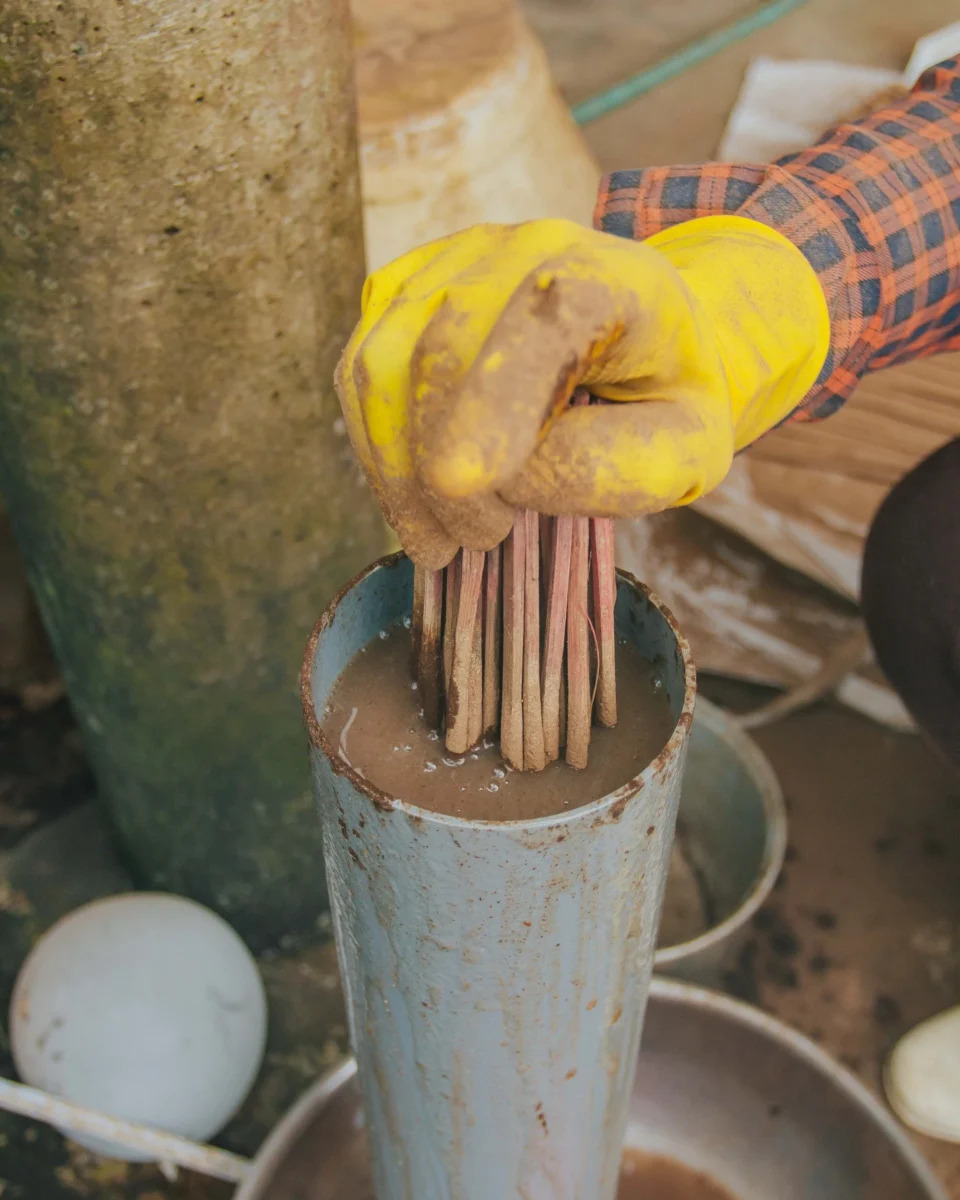 Các que tre được ngâm trong nước bột sắn để tạo chất kết dính, yếu tố quan trọng để cho ra những cây hương tự nhiên, không sử dụng hóa chất