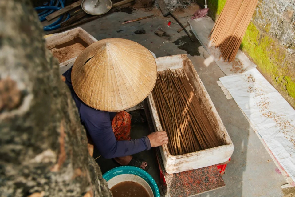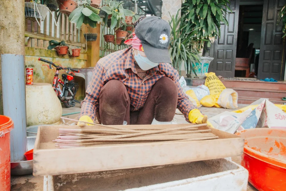 Việc làm hương thủ công đòi hỏi người theo nghề phải có sức khỏe khi phải ngồi từ sáng đến chiều tối để ngâm que tre vào chất kết dính (được nấu từ cây sắn), cho vào hộp xốp và rắc bột nguyên liệu vào rồi lắc đều để bột hương dính vào các cây tre.